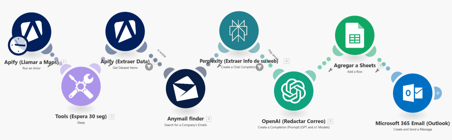 Este sistema Busca a tus clientes ideales, les envía correos personalizados y organiza todo automáticamente en un solo lugar.